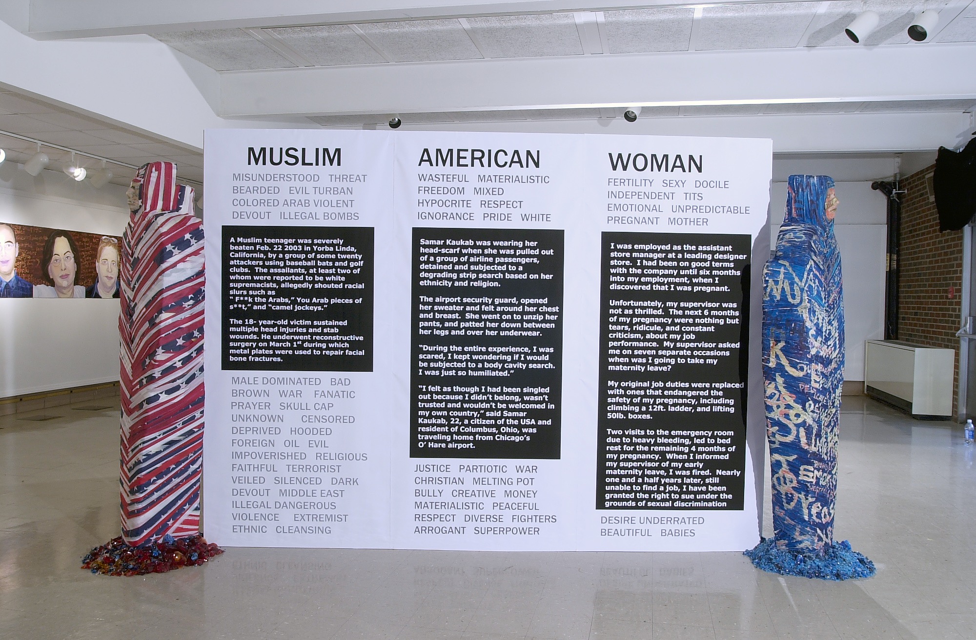 The large-scale installation, Muslim American Woman, unfolds from the center of the room with oversized six feet newspaper billboards filled with stereotypes associated with the words: Muslim, American and Woman. These words were collected from over hundreds of people. The posters also record incidents of hate-crimes and discrimination that people have experienced from all walks of life. The individual stories range from a young boy harassed in school because he has a name resembling Osama Bin Laden, to a young Muslim girl that was strip-searched at the Chicago airport because she was wearing a head scarf. At the corners of the triangle are three figures; all wax casts of my body. One called American, the other Muslim and the last Woman. All three are literally and figuratively wrapped in the stereotypes that we associate with each category.
