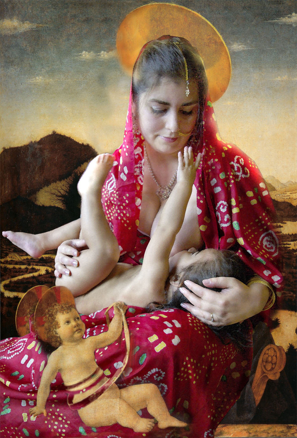 In “Copulating Virgin”, I reinterpret myths about the Virgin Mary, revealing ambiguities and conflicts faced in the lives of contemporary women. Clothed in my Muslim bridal dress, my figure is superimposed over the seated Virgin Mary. The architecture surrounding them is patterned with a 17th century illustration of sperm. “Indian Madonna and Child,” Clothed in a red, Indian bridal sari, I sit nursing my newborn daughter, my body superimposed over the seated Virgin Mary. The work internalizes the mixed signals Mary transmits about motherhood, purity, female strength, and sexuality. Through reconstructed religious icons, my work examines issues of geopolitics, gender and sexuality across cultural boundaries.