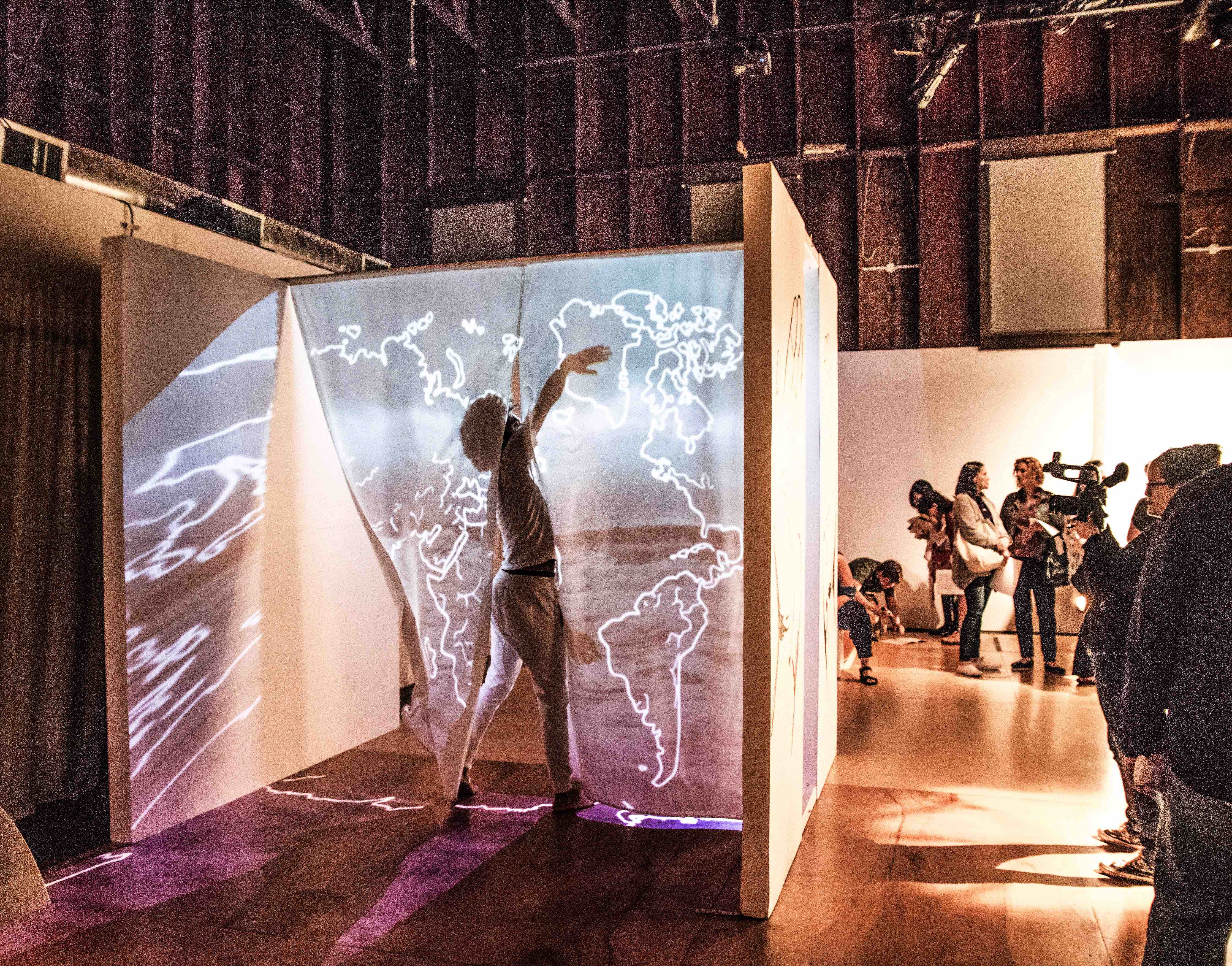 (Un)belonging is a participatory installation with projected animations, video and live performance. (Un)belonging presents a powerful exploration of both resistance and transcendence of the many boundaries faced in our world: emotional, political, physical. A video of a silhouette-performer is projected onto a screen with a slit that allows for passage through it. The manifestation “to belong” resides in the body, expressing moments of kindness, acceptance and welcoming versus rejection or pushing away. What is the impulse that wants to push the next newcomer out? This cycle of welcoming and excluding is explored through projected shadow movements which transgress these borderlines. I collaborated with three performers of color to choreograph movement cycles in response to the projected shadow figure and borderlines. Between the live performances, viewers are invited to move through the portal-like space and interact with the moving silhouette.
